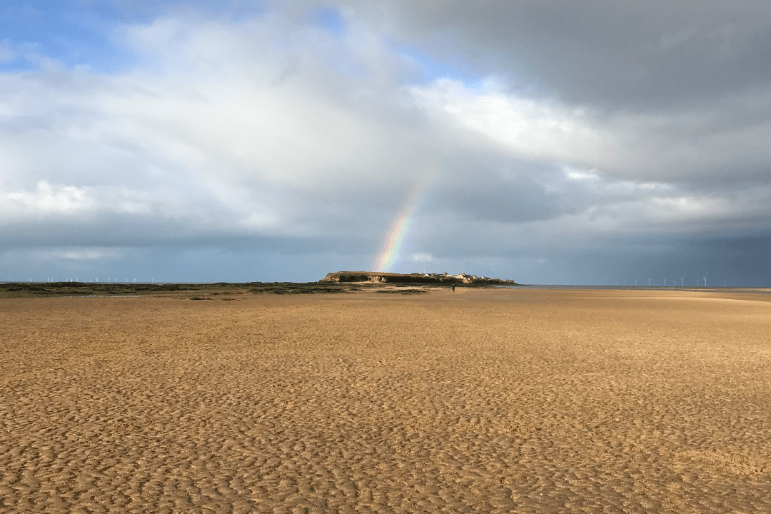 The first sandstone outcrop is nothing more than a stop-gap, a point in the safest route over to the main two islands. Nothing but a weathered and unidentifiable World War Two air raid defence. Onwards to Middle Eye, across the rocky seabed, dressed in blue mussels and seaweed. The air was damp, and ahead I saw a rainbow, landing on the beach on Middle Eye. I needed to stop and take a moment for this, and gaze back up the estuary. In any map you see, I would be standing in the middle of the ocean.