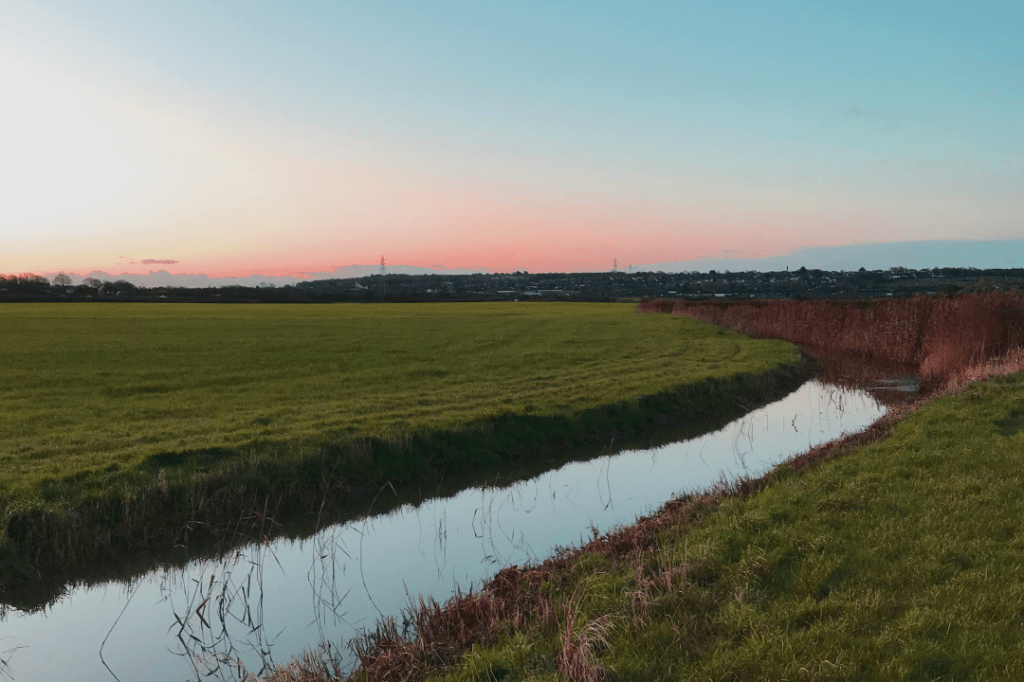 Checking the maps on my phone for any sign of a footpath or landmarks, I saw a thin string of blue cutting the direct route in half. I’d seen people walk this way in the past, so I just charged on. There were swells of birds rising and falling on the fields and all I could smell was dew, that settled in the back of my nose. As the day began to brighten, the thin string of blue materialised – the first liquid barrier of the day, swarmed in six foot reeds. I thought about it, but there was no way of jumping, so I continued along the stream as far as I could before another one boxed me in. This stream wasn’t surrounded by reeds, so I backed up ready to jump it. As I took a few steps back, I stopped to admire the quaintness of the stream, the crystal clear water, and the backdrop of the fields, the sandstone ridge, and coral sky. Utter stillness. It would be an idiotic affront to dawn to jump that stream. I decided to turn back.