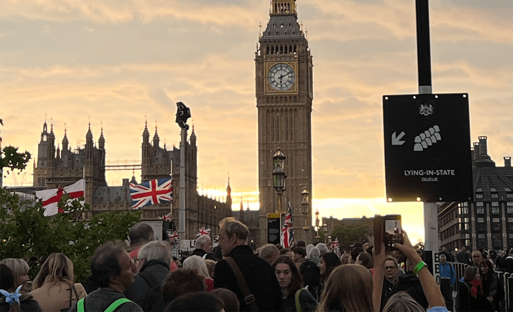 I continued walking parallel to the queuers, wondering if the queue to see the previous dead monarch’s coffin was this gleeful; so pleased to be involved. People had pints and cans, union flag blazers, people were dressed in all black, scouts and their older counterparts, the military, were there.